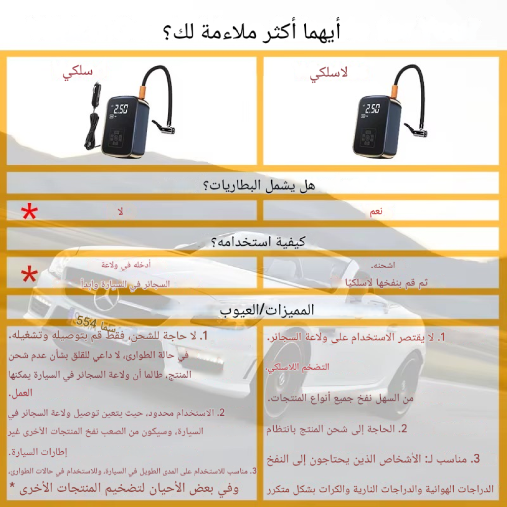يجب توصيل مضخة الهواء السلكية بولاعة السجائر في السيارة!! لا يمكن شحنها لاسلكيا ولا يمكن تخزين الكهرباء!!